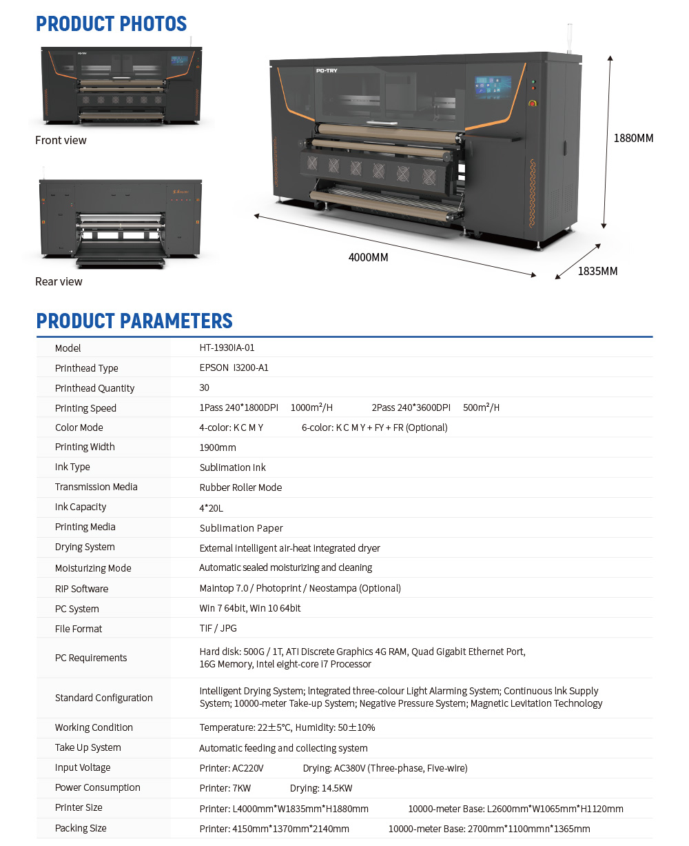 | Printer Size | Printer: L4000mm*W1835mm*H1880mm 10000-meter Base: L2600mm*W1065mm*H1120mm |